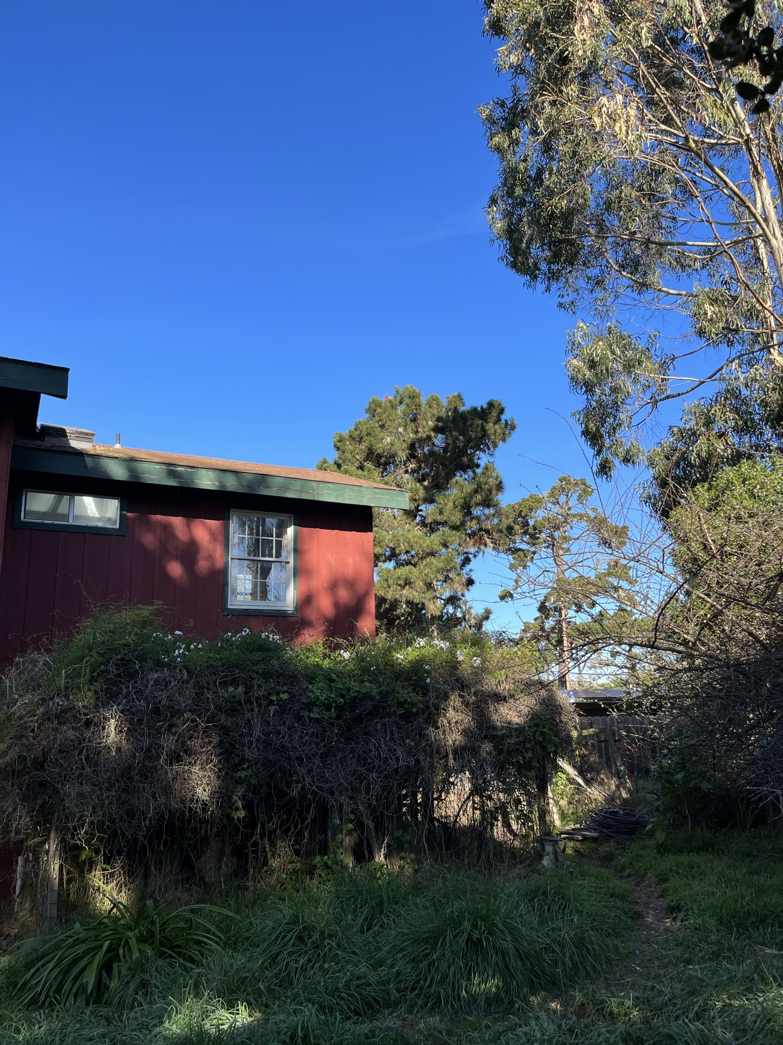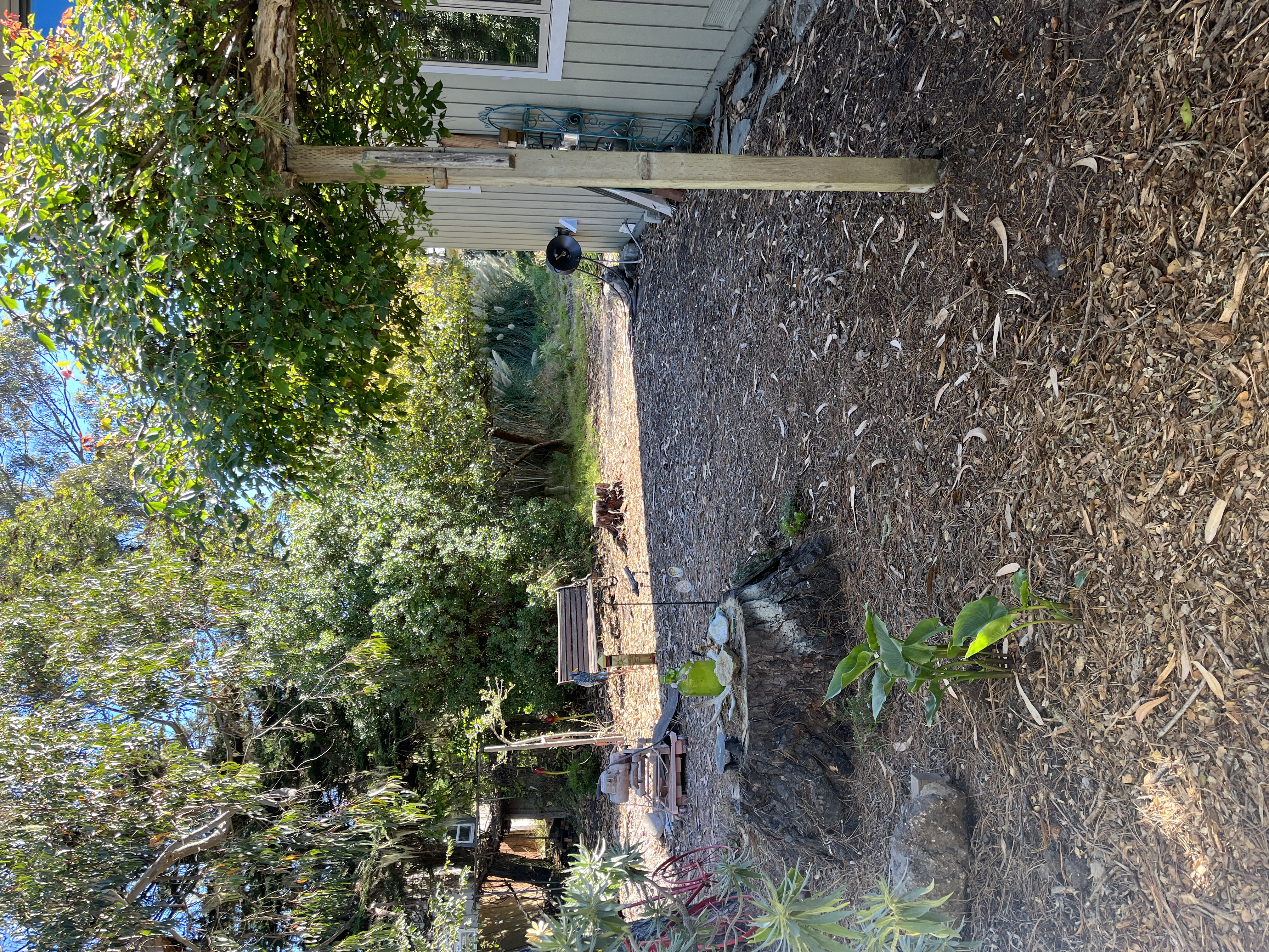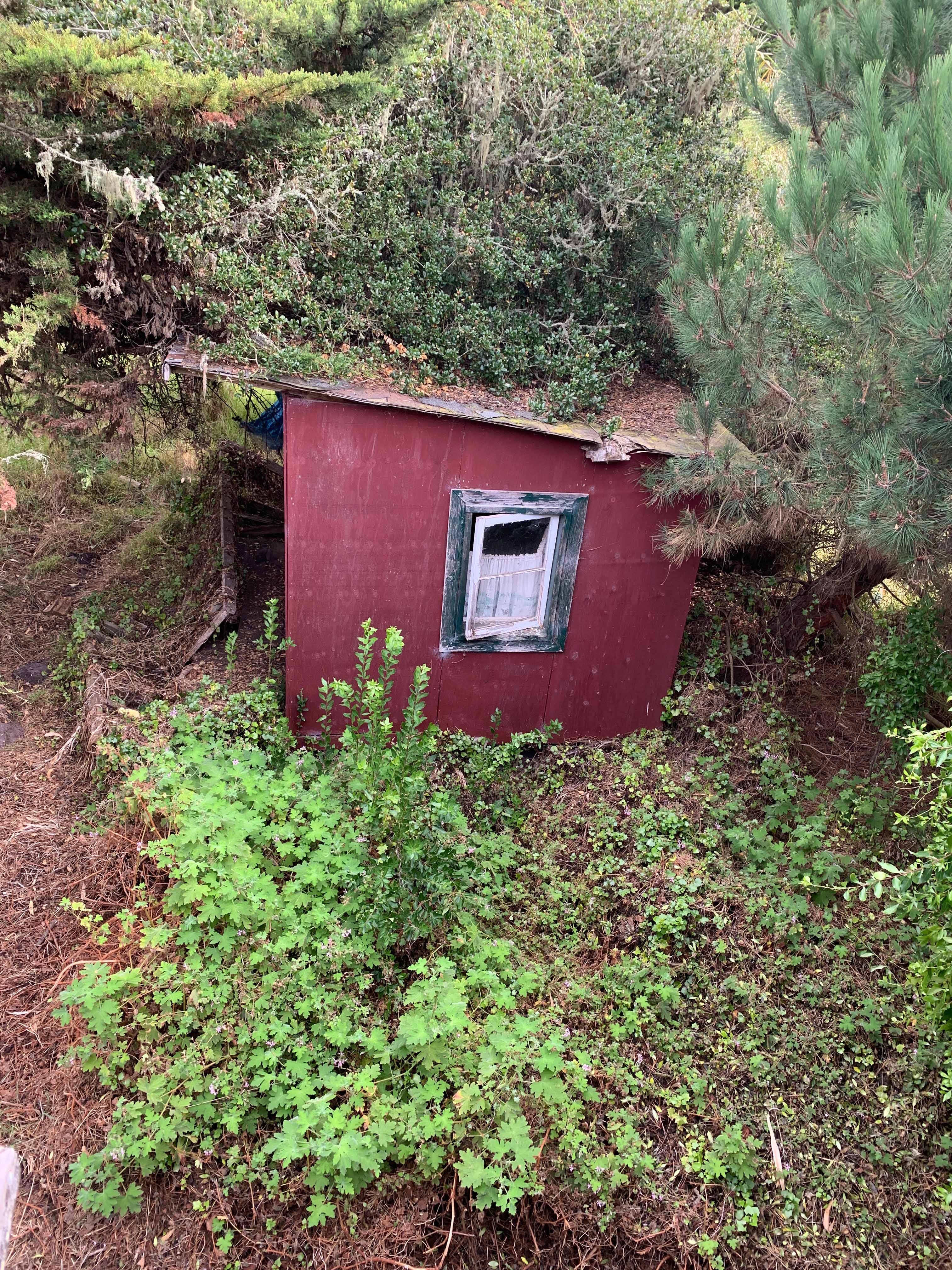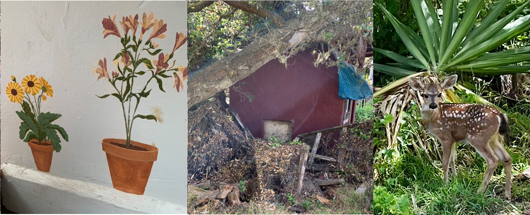 The backyard was a microcosm of coastal forest with barely navigable walking trails. A portion of it looked like Kansas in the Wizard of Oz. One tree crunched an outbuilding, but the house itself was unscathed.